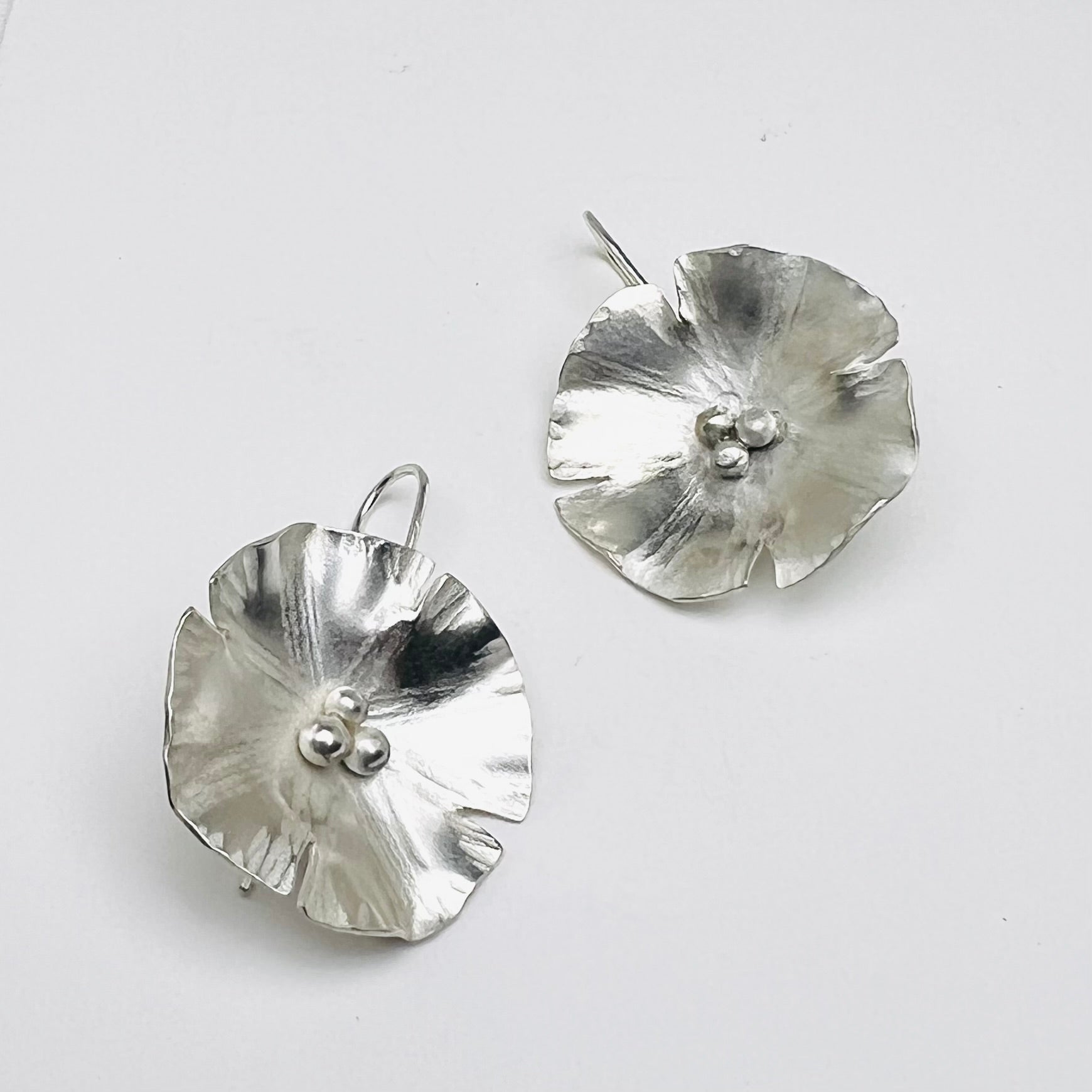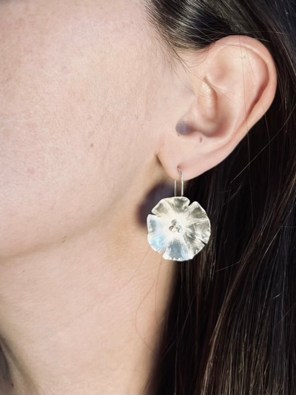 These Silver Poppy Earrings feature a delicate design inspired by the beauty of nature. Handcrafted with 94% pure silver and hammered for a unique texture, these lightweight earrings are the perfect addition to any outfit. The poppy has a diameter of about an 1.25” making them a subtle yet elegant earring.