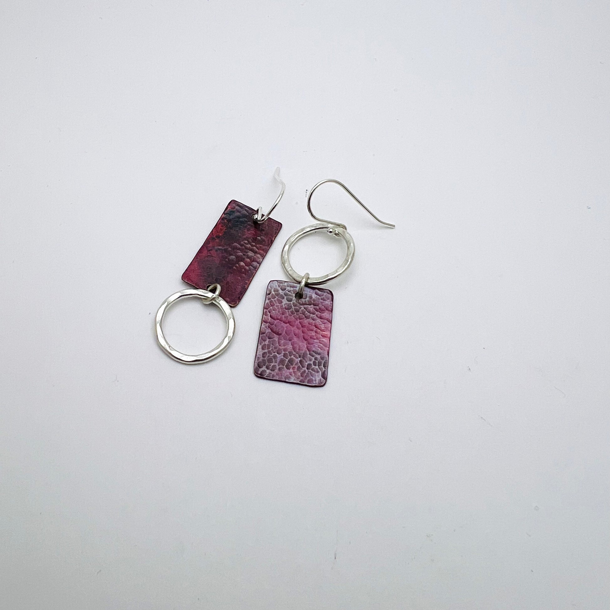 These unique mixed metal earrings are made from copper and high quality silver.  The copper rectangles have been heated and hammered to give them a unique red and textured appearance.  The silver circles also have a hammered texture.  These are earthy, and have an organic feel while rocking the asymmetry and geometry.