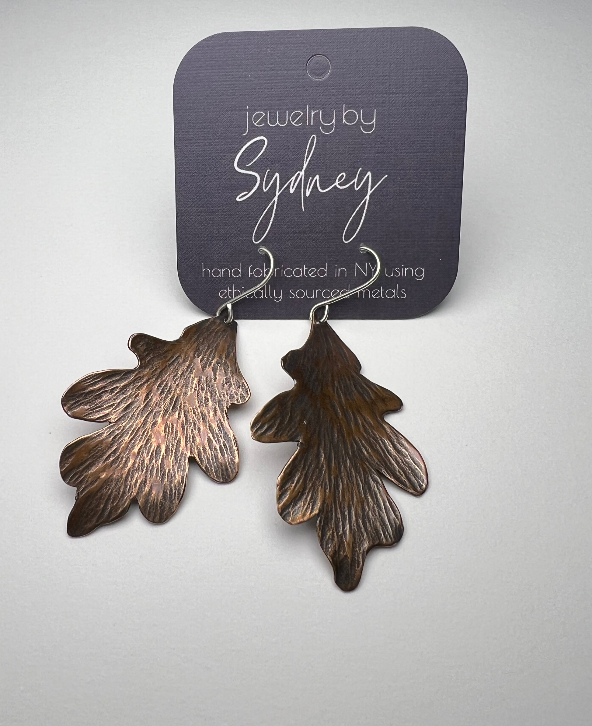 Hand fabricated and hammered copper oak leaf earrings.  Perfect for those who want to wear a little forever nature.  The hammered texture and patina give these an organic and boho look.