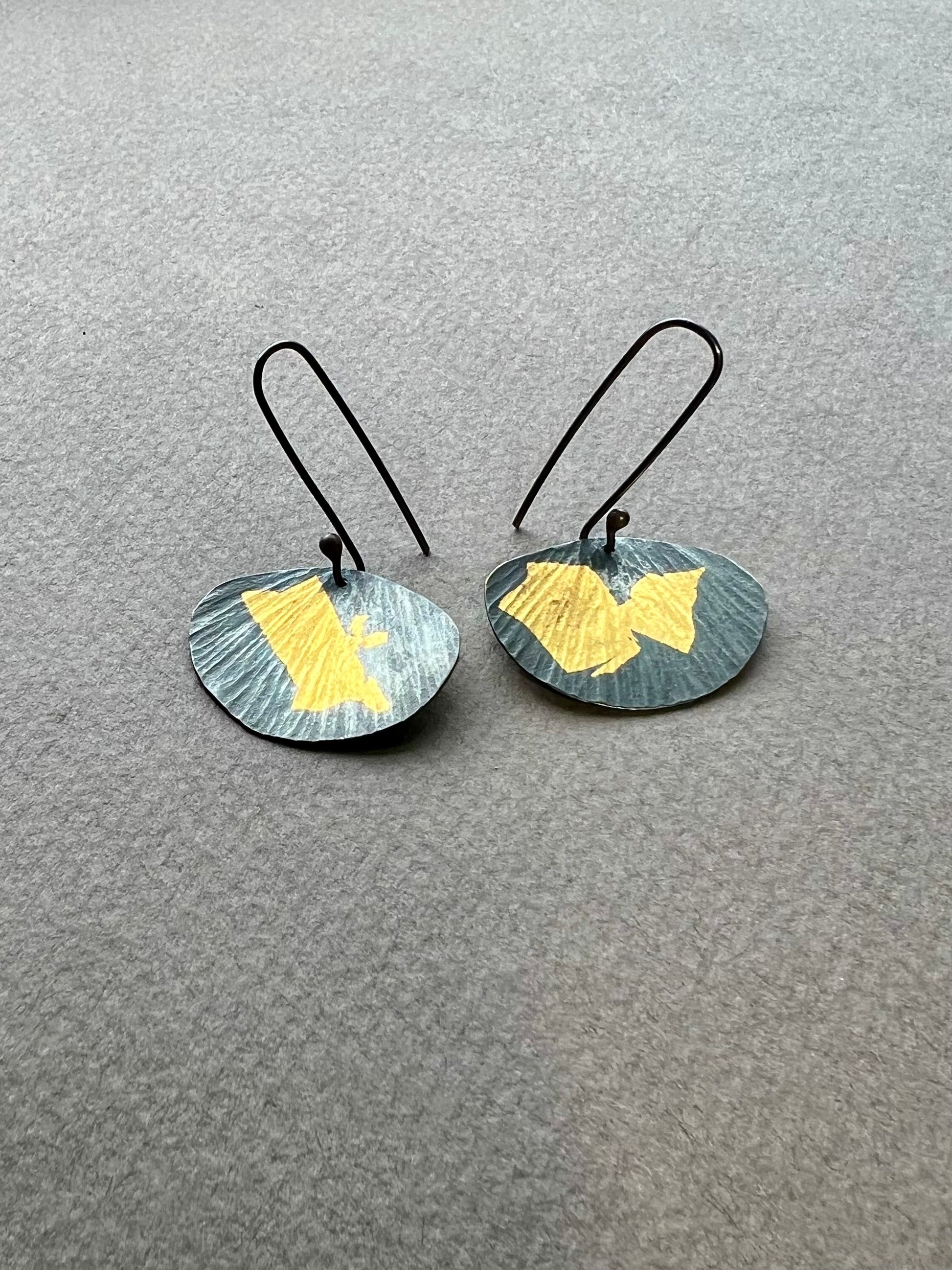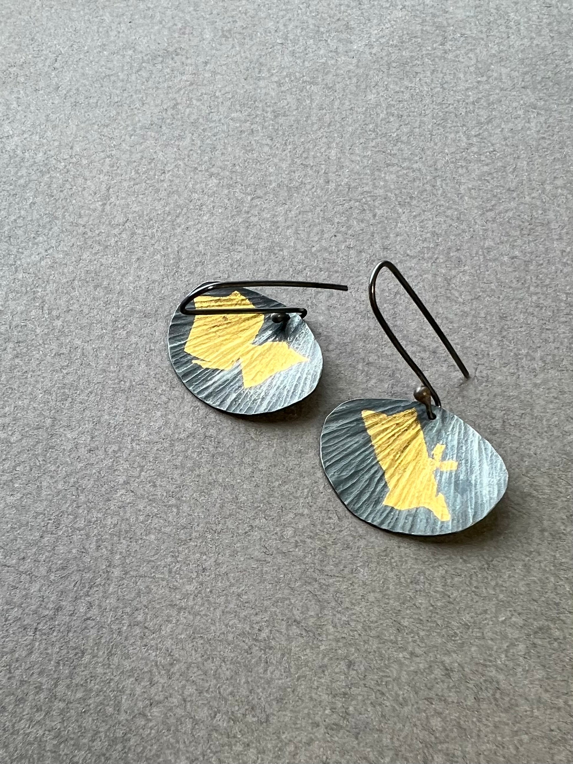 A simple organic shape resembling a pebble, petal or perhaps a leaf?  The gentle curves and hand hammered texture give these minimalist earrings an earthy and natural feel.  The 24 karat gold leaf adds elegance and warmth.  These are finished with a dark matte gray finish on the silver to make the gold pop.  The shape is about one inch wide and they hang a total of about 1.75”.