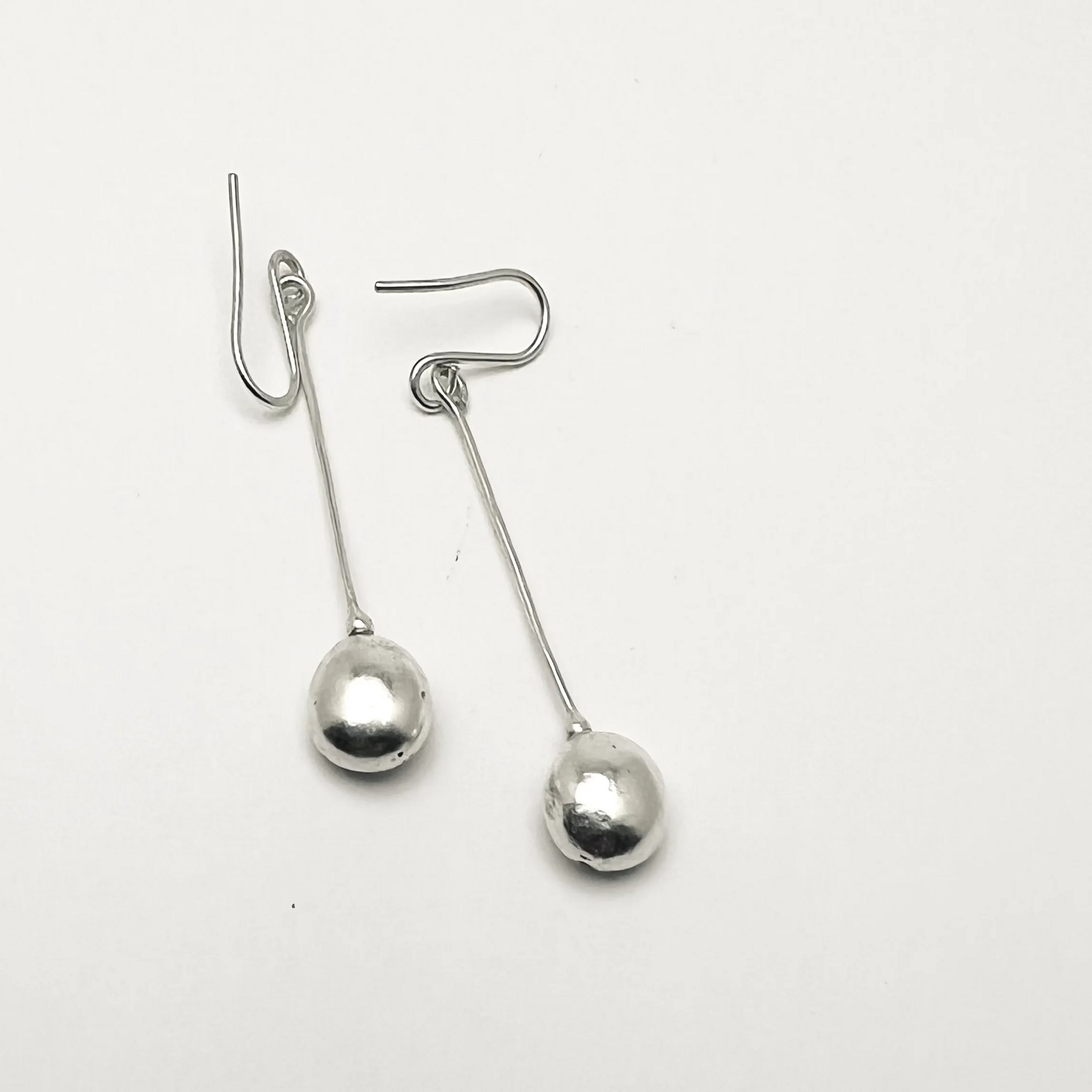 These handmade silver drop earrings are made by melting silver into gentle round egg shapes.  They are melted individually so will have unique textures on back, and the front has a lovely smooth and shiny finish.  They are attached to long silver posts that gently sway as they are suspended from french hooks.
